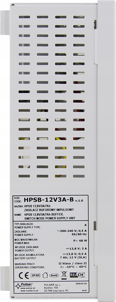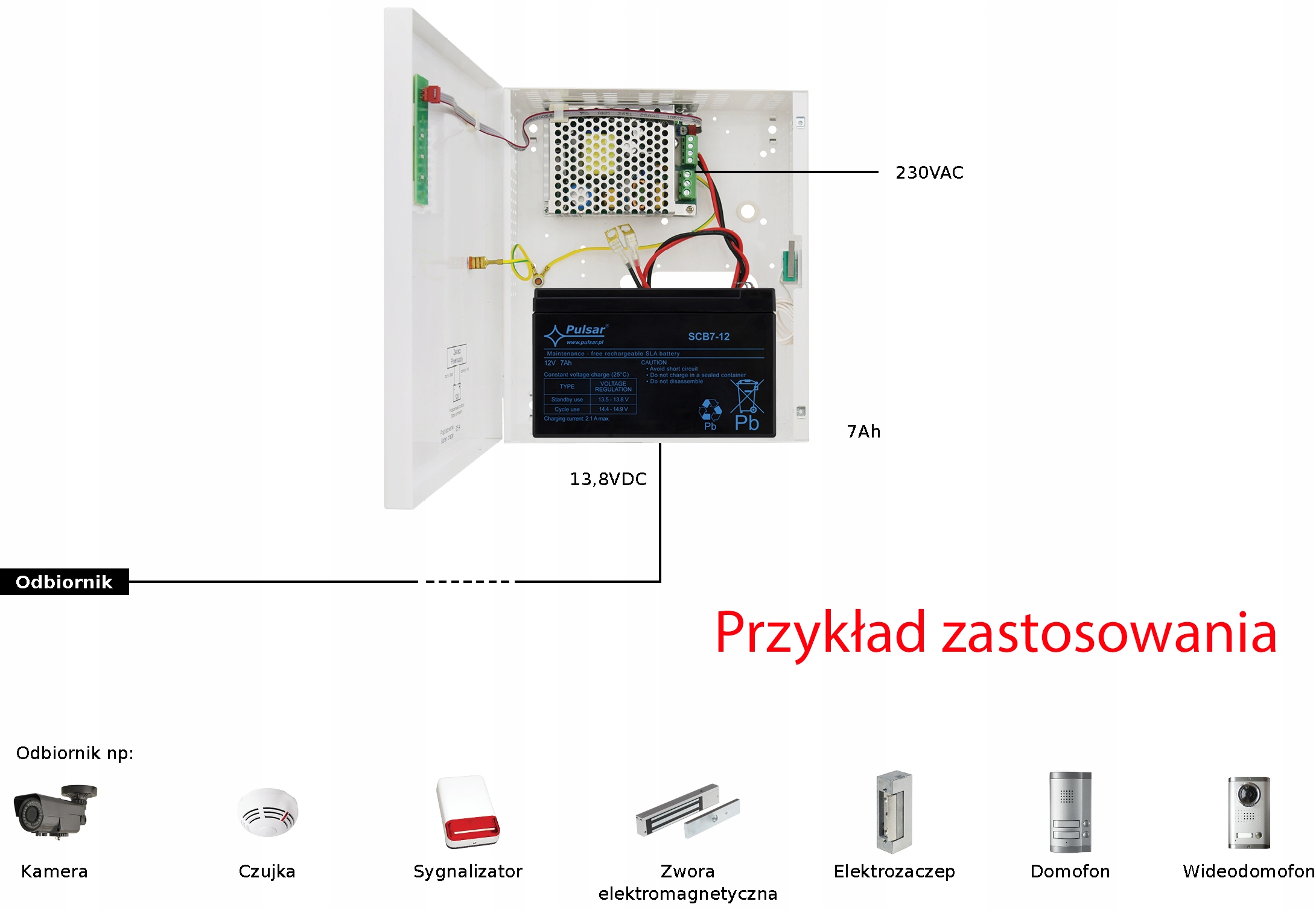 У разі зникнення напруги в мережі пристрій негайно перемикається на живлення від акумулятора. Блок живлення побудований на основі імпульсного модуля живлення з високою енергоефективністю та розміщений у металевому корпусі (колір RAL 9003) з місцем для акумулятора 7Ah/12V. Корпус оснащений мікроперемикачем, що сигналізує про відкриття дверей (передніх).