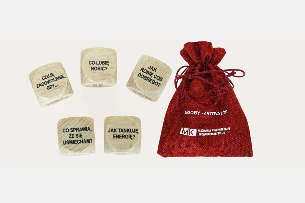 Набір складається з п’яти великих дерев’яних кубиків із запитаннями та реченнями, які заохочують до роздумів. Гра проста у використанні – учасник кидає кубик і відповідає на витягнуте запитання або закінчує речення, що стимулює його творче мислення та самопізнання. Посібник у форматі PDF, що входить до комплекту, містить докладні поради та вправи, які полегшують роботу з інструментом.