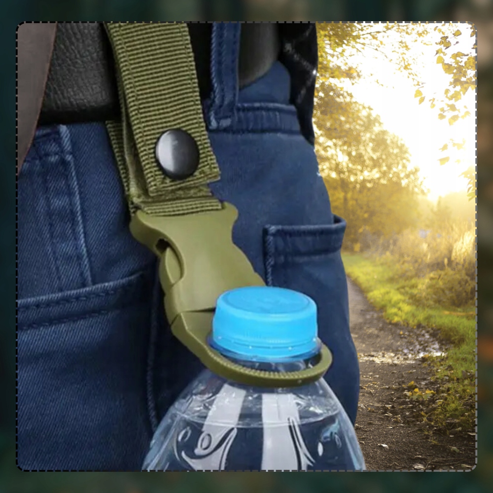 - Карабін для кріплення пляшок: Кожна пряжка оснащена міцним карабіном, який дозволяє швидко та безпечно кріпити пляшки, тому ви можете бути впевнені, що вони завжди будуть на місці. Це ідеальне рішення для тривалих маршів, експедицій на виживання чи повсякденних прогулянок.