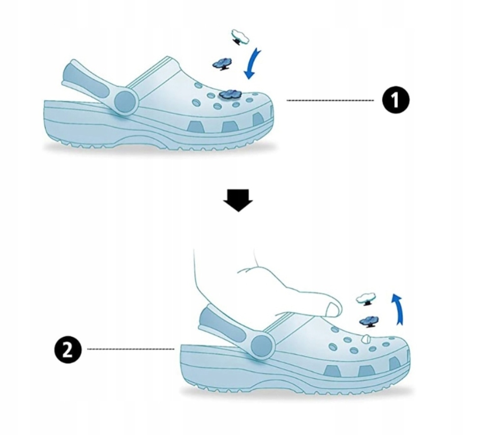 Щодо оригінального взуття Crocs (для дорослих), отвори мають діаметр близько 8 мм, завдяки чому наші шпильки легко одягати та знімати.