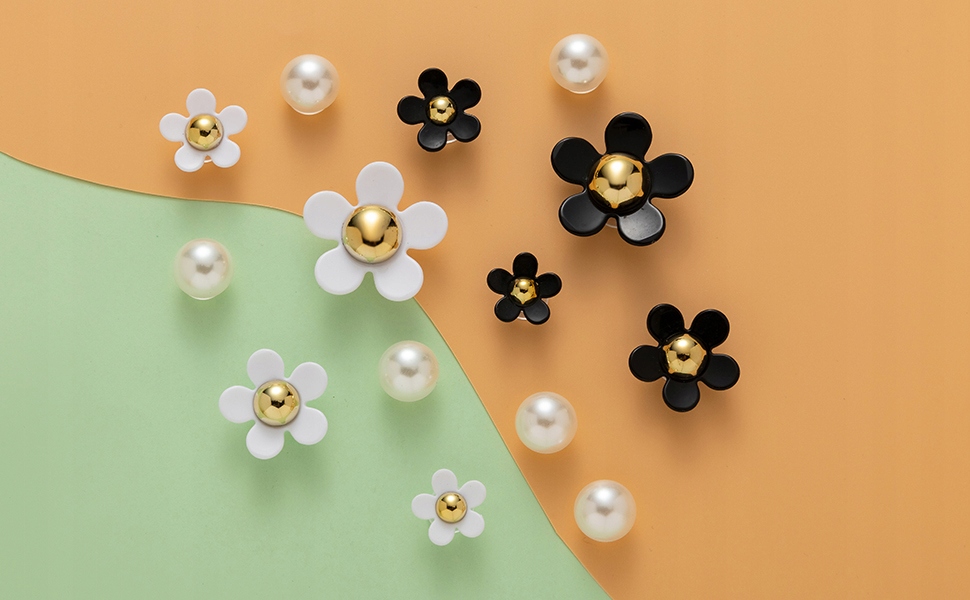 Підвіски для взуття у формі квітки. Ви отримаєте 16 підвісок для взуття у формі ромашки та 12 підвісок із білими перлами. Ці чудові підвіски доступні в 2 кольорах (білий і чорний квіти) і 4 різних розмірах. Ви можете використовувати їх для пляжних босоніжок, літніх водних туфель, водних гірок, браслетів, гаманців з дірками тощо.