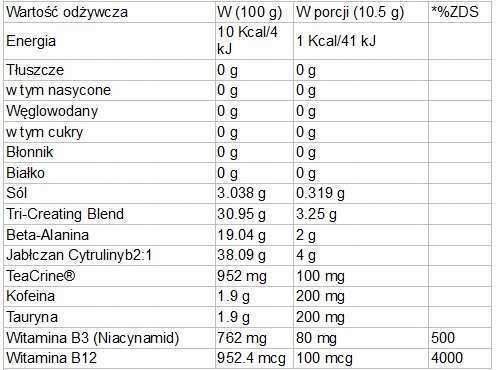 Попередження: не перевищуйте рекомендовані щоденні дози. Продукт не слід використовувати як заміну різноманітного збалансованого харчування. Зберігайте в недоступному місці для маленьких дітей. Якщо вам не виповнилося 18 років, ви знаєте або підозрювані захворювання та/або приймаєте ліки, зверніться до кваліфікованого медичного працівника. Цей продукт підходить для веганів. Високий вміст кофеїну (200 мг/10,5 г). Він не рекомендується використовувати у дітей та вагітних або грудних годуючих жінок. Зберігайте цей продукт у прохолодному, сухому місці, недоступному для дітей. Номер зберігання та партія є на етикетці.