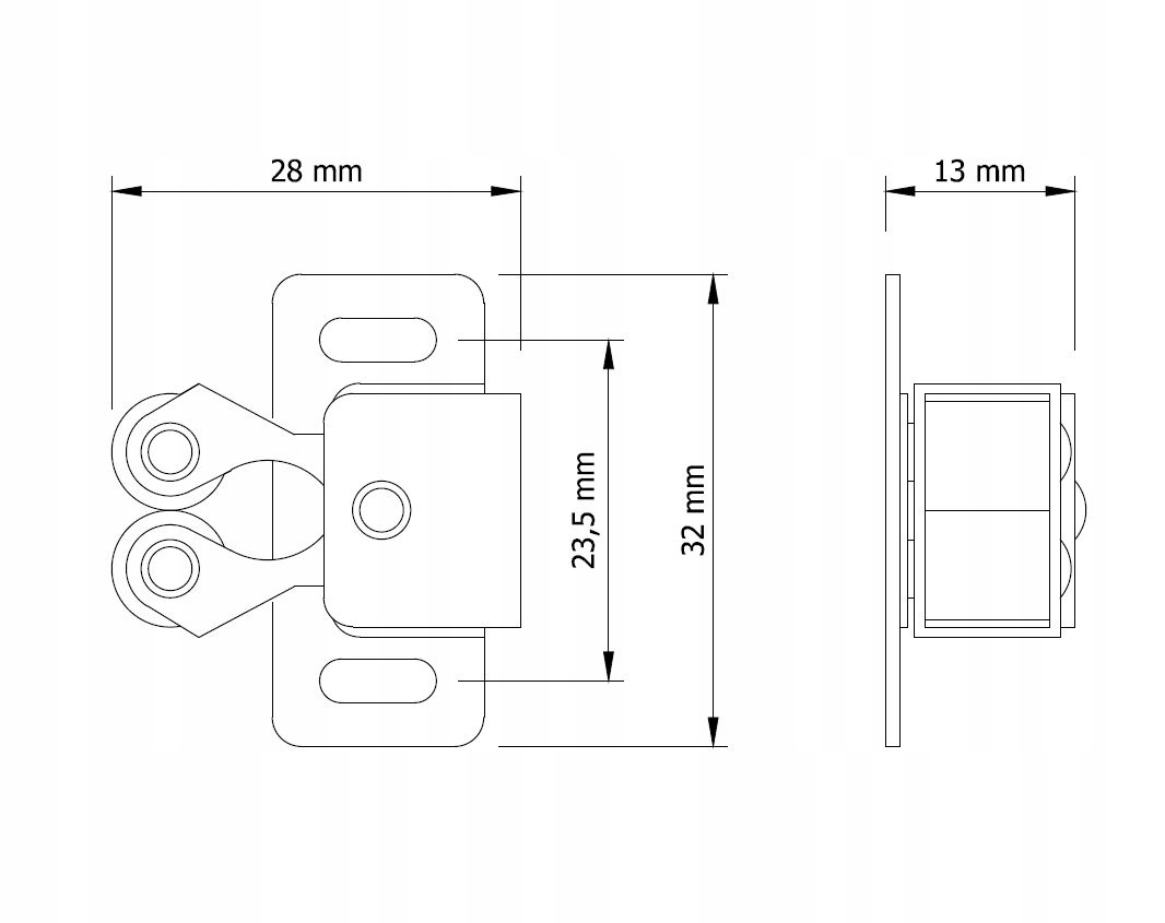 Роликова засувка меблева, 2 елемента, призначена для установки в шафи на замок від відкривання. Перший елемент прикручується до дверей за допомогою фіксатора, пригвинченого спереду. Другий пригвинчується всередину шафи - кріпиться до двох отворів для бобів.