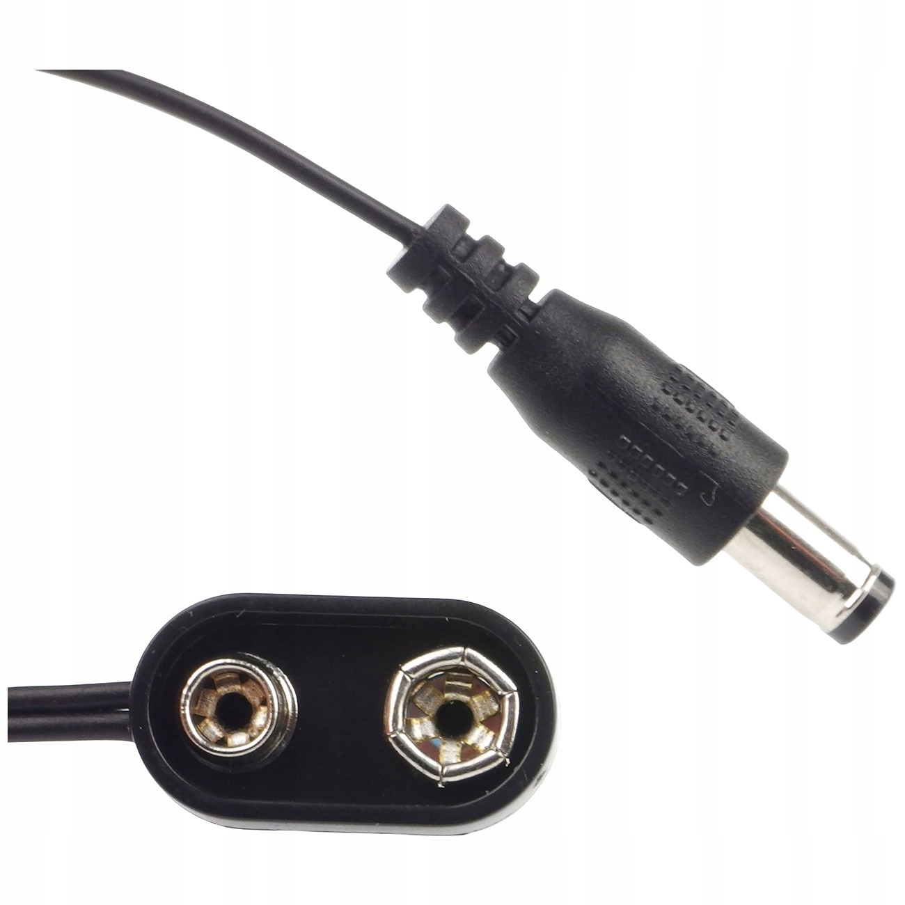 Кабель із засувкою для батареї 9 В (тип 6F22), закінчений штекером DC 2,1 × 5,5 мм з плюсом посередині. Призначений для живлення пристроїв, які потребують напруги 9 В і мають роз’єм живлення постійного струму, наприклад, гітарних ефектів, плат Arduino, плат розробки, світлодіодного освітлення та інших електронних проектів. Довжина кабелю становить прибл. 125 мм, ізоляція з ПВХ чорного кольору, жила з лудженої міді стандарту 22 AWG. Діапазон робочих температур від -20°C до +60°C.