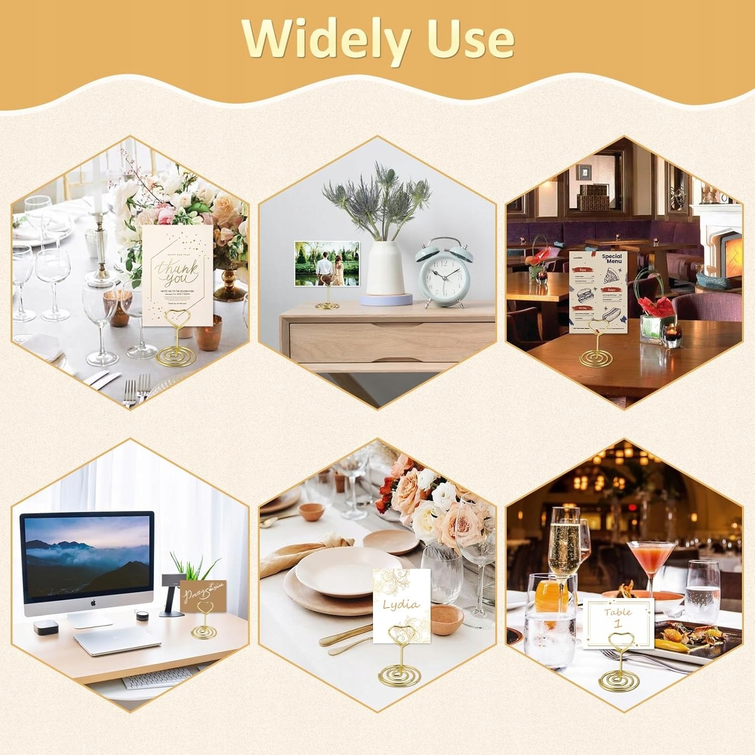 Універсальний настільний декор: ці металеві тримачі для банкнот надзвичайно універсальні, підходять для різноманітних випадків і місць. Використовуйте їх як тримачі карток для весільного столу, для демонстрації сувенірів на вечірці або просто як стильний спосіб упорядкувати нотатки вдома чи в офісі. Їх міцна конструкція гарантує, що вони можуть утримувати різноманітні картки та нотатки, від візитних карток до маленьких фотографій. Уявіть собі, як вони прикрашають весільний прийом, витончено та чарівно тримаючи в руках картки з іменами гостей. Або уявіть їх на своєму столі, упорядковуючи списки справ і нагадування. Їх адаптивність робить їх необхідним аксесуаром для тих, хто хоче додати до свого життя нотки елегантності та організації. Ці кліпи ідеально підходять для показу меню, фотографій або навіть невеликих вивісок на вечірках.