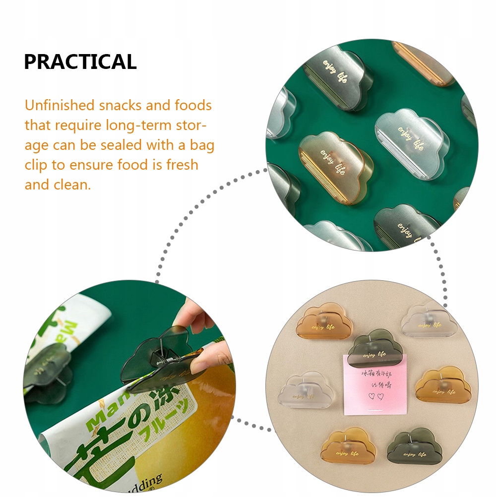 Це ущільнювальні кліпси, які виготовлені з матеріалів найвищої якості, є міцними та можуть використовуватися протягом тривалого часу. Незакінчені закуски та продукти, які потребують тривалого зберігання, можна закрити за допомогою затискача для сумки, щоб зберегти їжу свіжою та чистою. Невеликий розмір, простий у використанні та забезпечує гарне та комфортне відчуття використання.