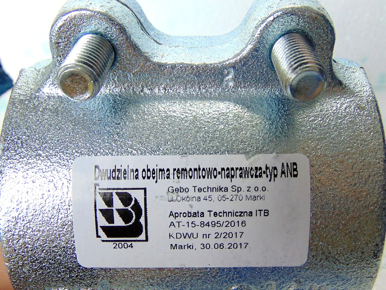 Хомути ANB Виготовляються з ковкого чавуну і призначені для ремонту сталевих і поліетиленових трубопроводів. Вони використовуються для закладення отворів, тріщин, плям корозії та протікань, викликаних морозом. Основним ущільнювальним елементом є гума EPDM, дозволена для використання в питній воді PN 16 бар