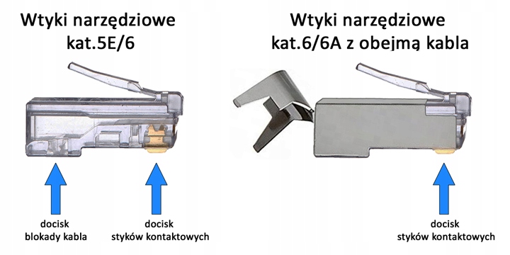 Розмістивши " classic" RJ45 tool connector cat. . 5E або 6 полягає в натисканні на контактні штирі (щоб вони пробили ізоляцію проводів і забезпечували належний контакт) і натисканні на фіксатор кабелю (завдяки якому штекер постійно фіксується на кабелі) . Інструментальні роз’єми категорії 6/6A RJ45 екрановані та оснащені кабельним затискачем (затискач хвоста). Цей затискач використовується для забезпечення контакту з екраном кабелю та для фіксації вилки на кабелі. Заглушки інструментів категорії 6A із затискачем не вимагають блокування, оскільки це може призвести до деформації екрана.