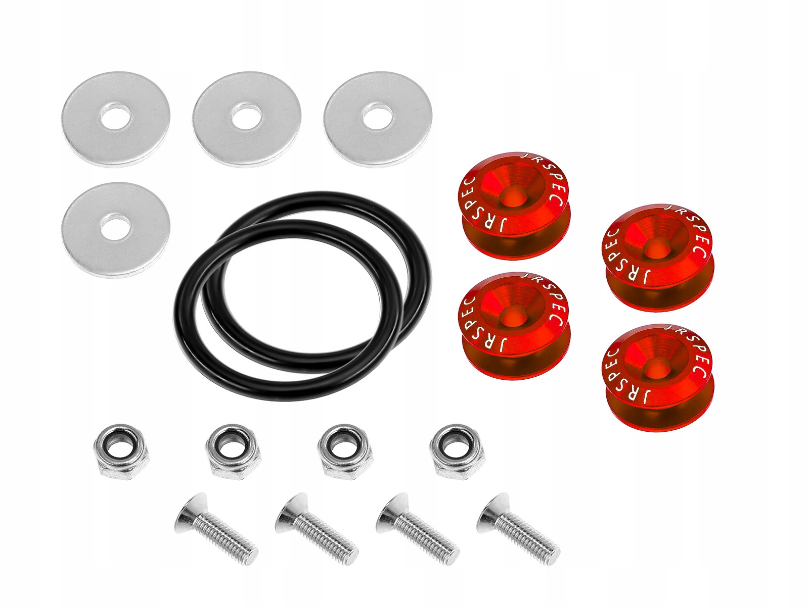 Універсальні фірмові застібки JRspec виготовлені з алюмінію діаметром 24 мм. Вони дозволяють швидко збирати та розбирати, наприклад, бампер, з’єднуючи два алюмінієві перехідники гумовою стрічкою. Їх можна використовувати для капота, люка, бампера і т. д. У комплекті 4 кліпси, 2 гумки, гвинти з гайками і шайби. Міцна конструкція забезпечує безпеку і комфорт використання. Вони призначені для автоспорту, закритих приміщень.
