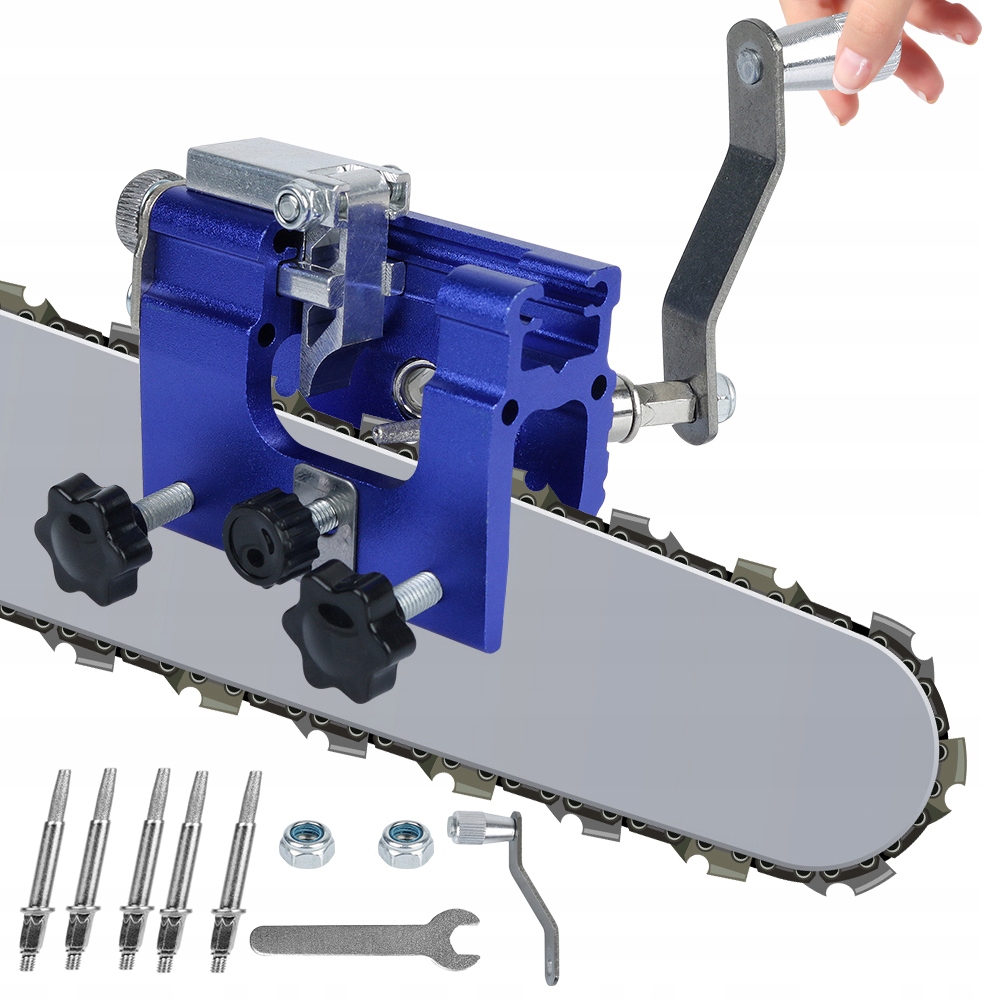✅Просте керування:Точилка проста у використанні. Просто покладіть затискач на направляючу шину, встановіть собачку на зуб, вставте лезо в направляючу втулку та поверніть рукоятку.