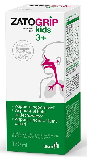 ЗАТОГРИП Кідс – сироп для дітей від 3 років зі смаком малини, має подвійну силу завдяки поєднанню рослинних екстрактів кореня африканської герані та плодів бузини чорної.