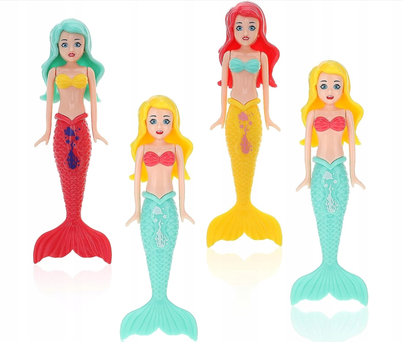 Цей набір іграшок для басейну включає 4 різнокольорові пірнаючі русалки та 3 іграшки з водоростями. Розмір іграшки-русалоньки приблизно 14 см × 2,4 см. Розмір іграшки-водорості приблизно 16 см × 3 см. Чудова якість виготовлення, яскраві кольори, а колір поверхні не спадає легко.