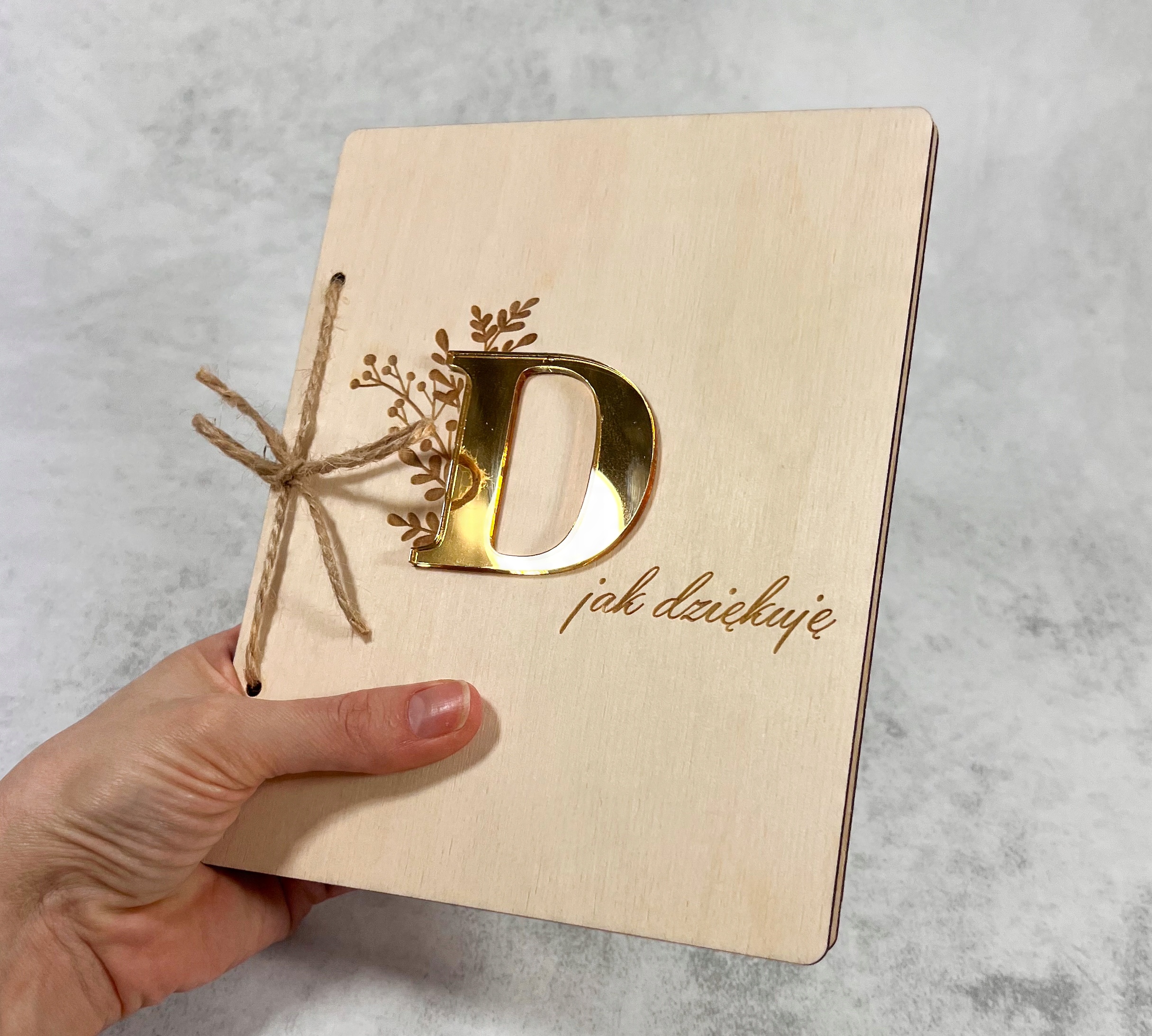 Картка, пов'язана з джутовим рядком. Передня частина картки прикрашена золотою літерою.