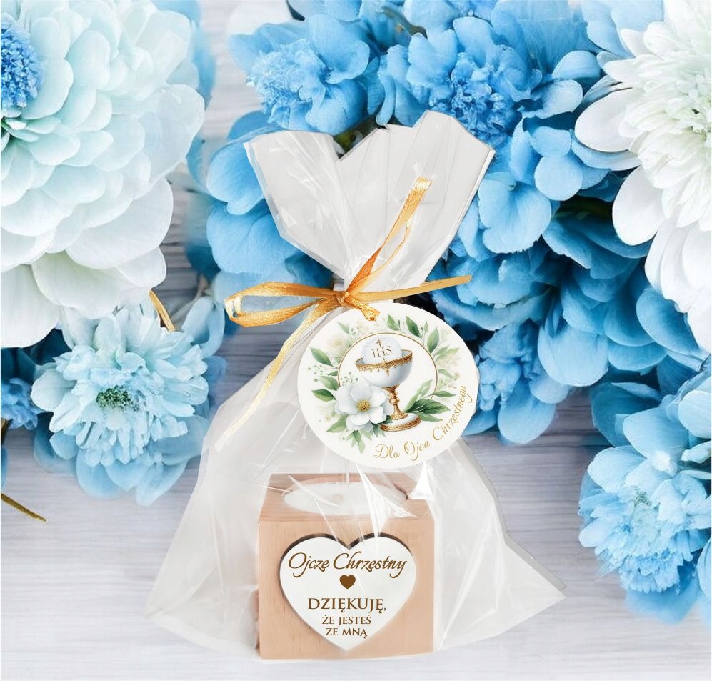 гравіроване серце на дерев’яному свічниці дає йому унікальний персонаж. Він упакований у целофановий мішечок, прикрашений золотою стрічкою.