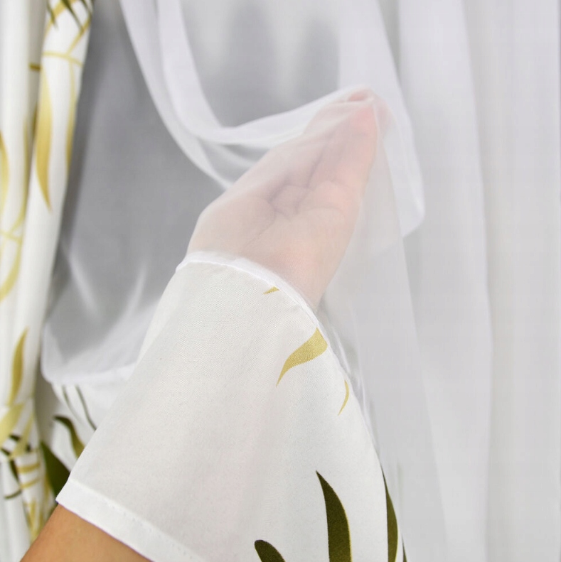 Центр завіси, виготовленої з високоякісного білого кольору. Дно завіси завершено ніжним малюнком із квітковим мотивом, виготовленим з матеріалу для розтяжки Панами. Штори також виготовлені з матеріалу для розтяжки Панами. Універсальна білизна тканина надзвичайно довговічна і красиво розташована.