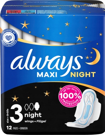 4 Завжди Maxi Night-це товста колодка, яка забезпечує до 100% захист завдяки його витікному бар'єру та ультрабазовному ядру. Щоб дізнатися більше про продукти завжди, відвідайте веб -сайт завжди.