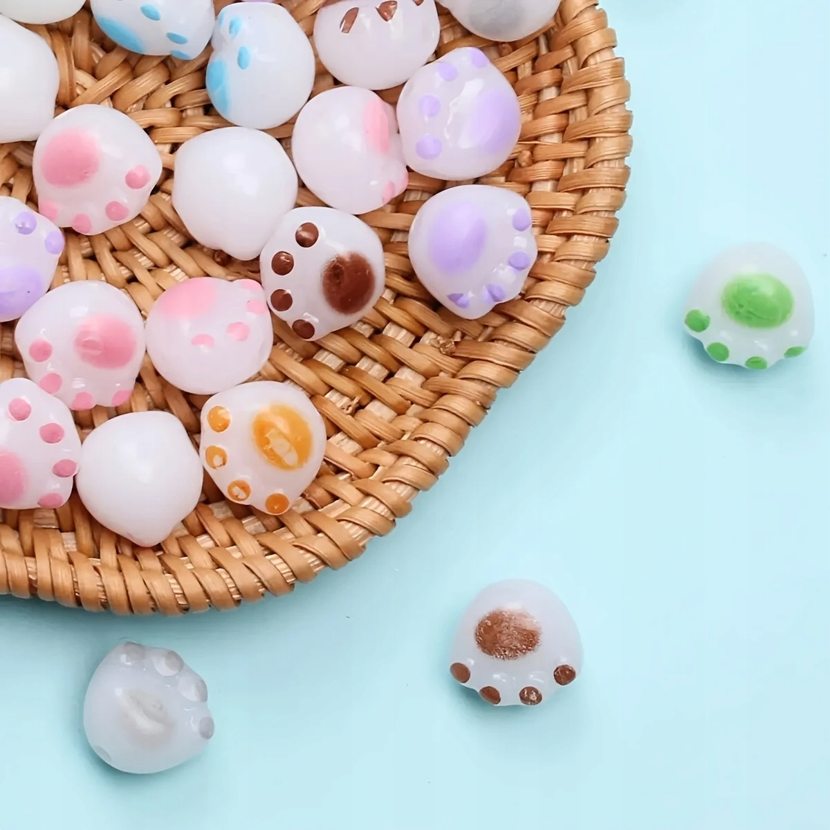 намистини акрилових підвісок, у формі котячих ніг - білі з рожевими плямами.