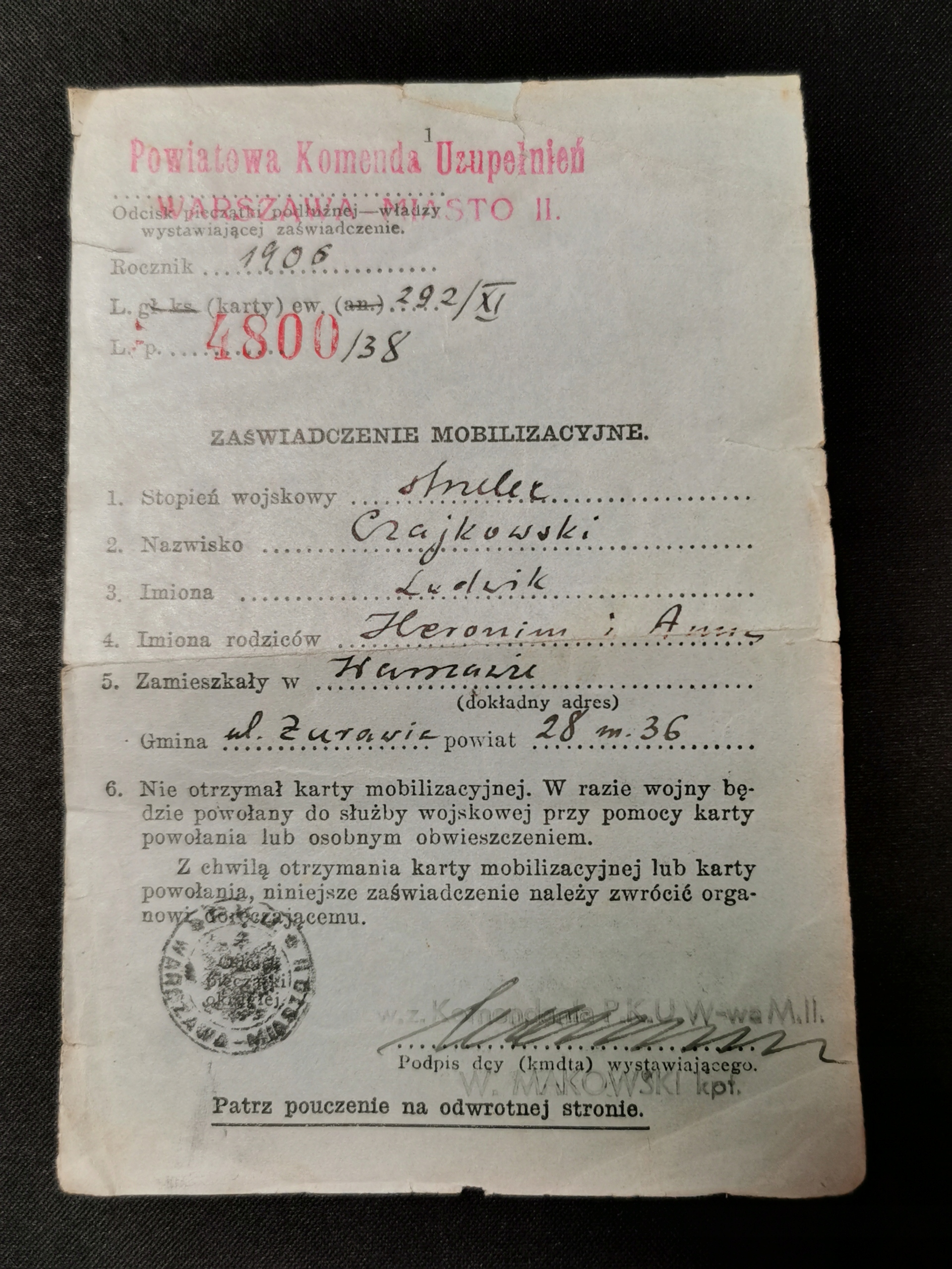 Zaświadczenie Mobilizacyjne Warszawa 1938
