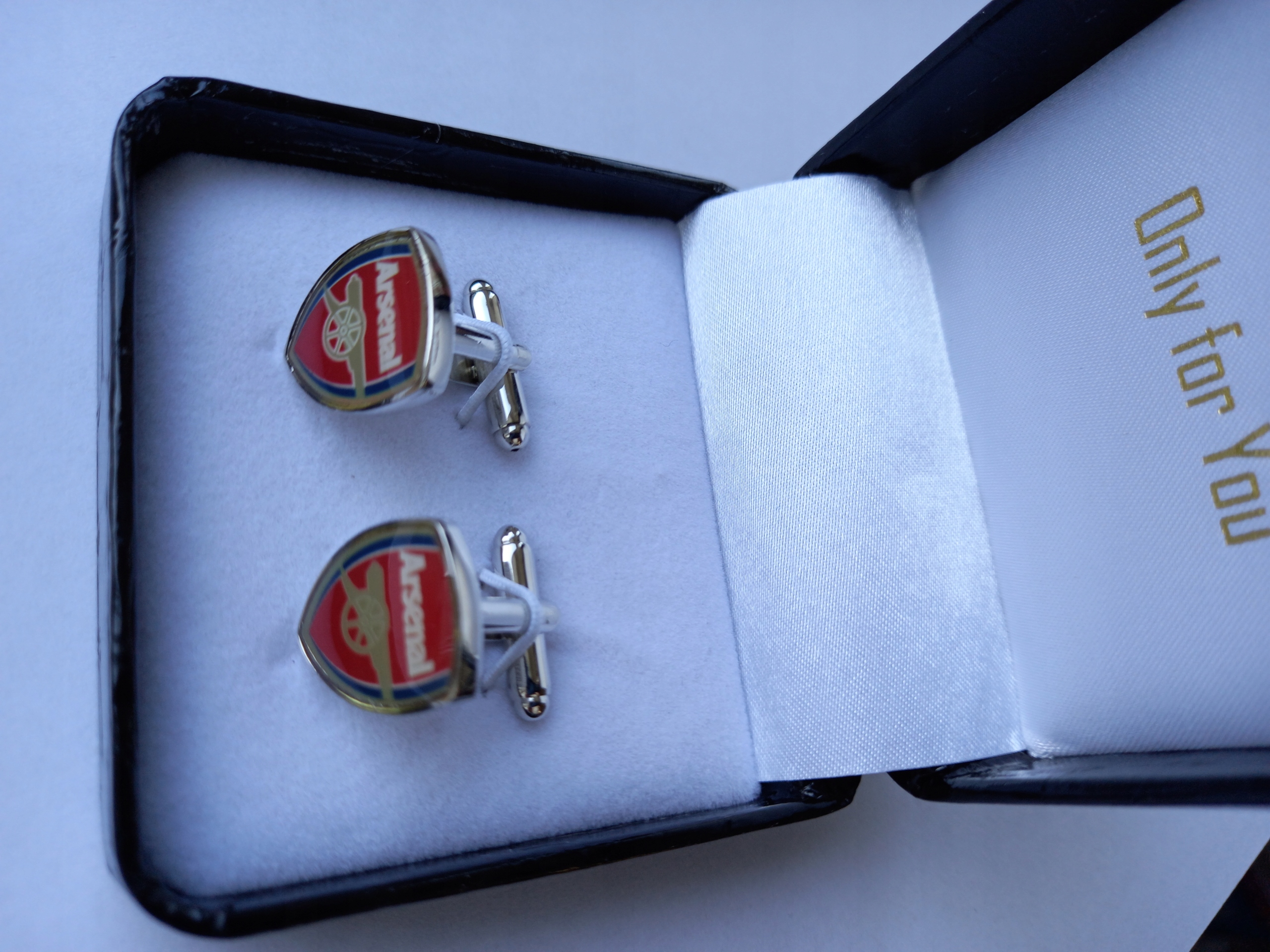 Прекрасний оригінальний набір пари манжевих зв'язків для захоплюючих сорочок, манжет виготовляли з дорогоцінного металу з логотипом футбольної команди "Арсенал Лондона", як на фотографії.