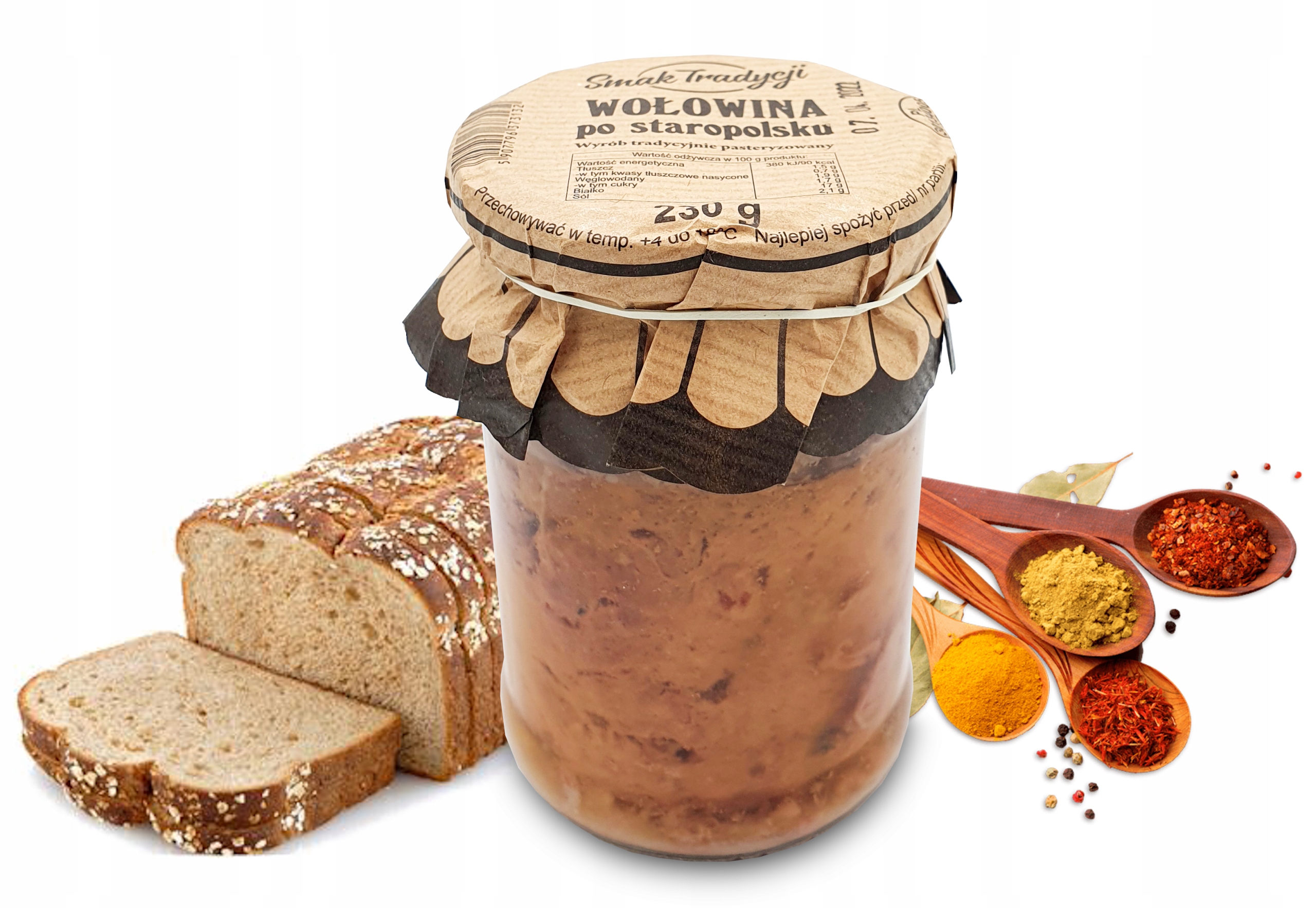 Старопольська яловичина в банці - це пастеризований продукт, виготовлений традиційно за власними рецептами. Він містить яловичину в оточенні желе. Маса набуває форми баночки, яка є упаковкою продукту.