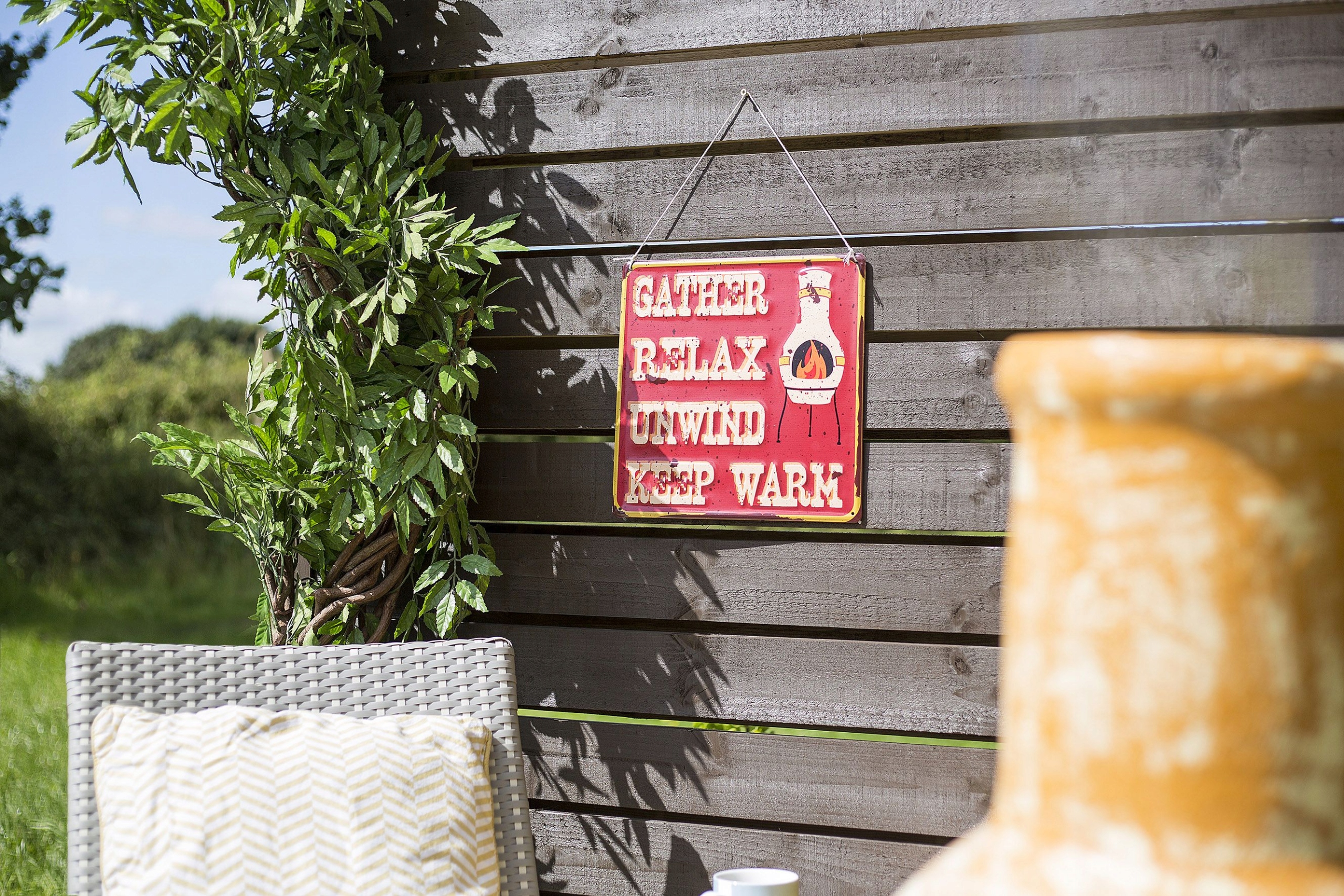 Притиснута металева пластина з написом "Зберіть розслаблення", сприяючи проведенню часу разом на терасі або в саду теплим вогнем від вогню, саду вогнища або каміну.