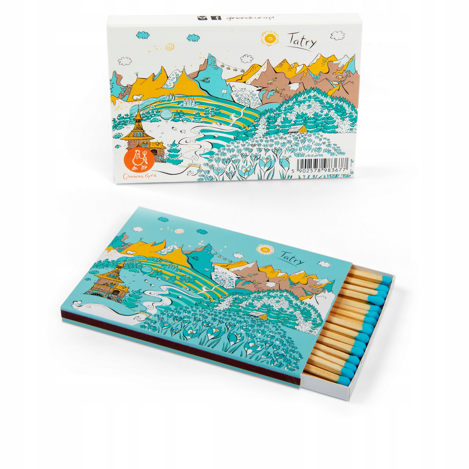 Велика ілюстрована сірникова коробка з бірюзовими головками.