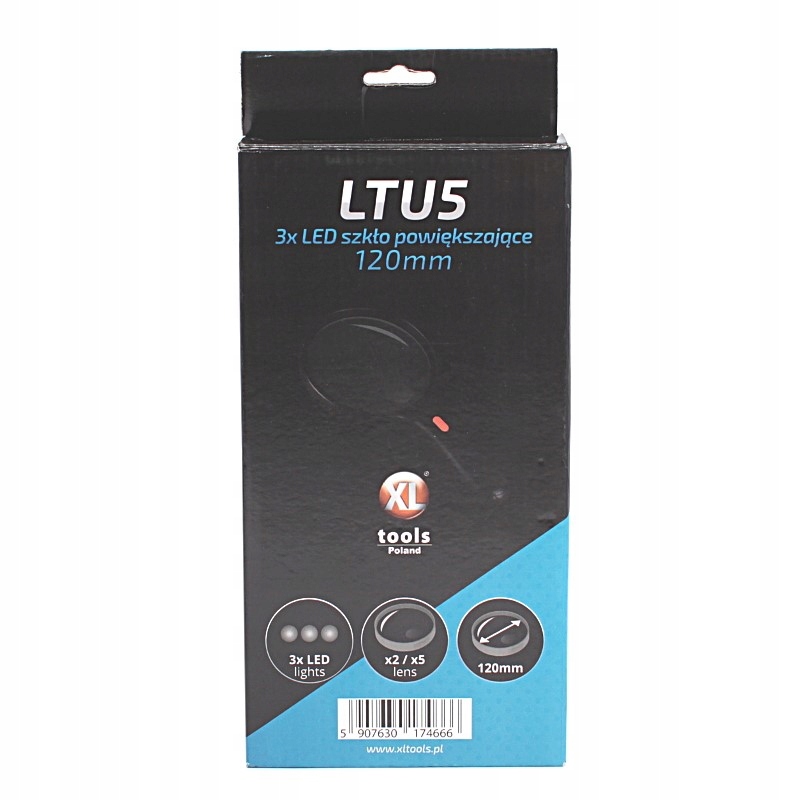 луна x2 - 120 мм, скло x5 - 28 мм. Це подвійне довгасте скло ідеально підходить для годинників, електроніки, ювелірів, нумізматики та саморобних робіт. Він широко використовується для роботи з невеликими елементами. Об'єктив виготовлений з акрилового скла. Великий об'єктив діаметром 120 мм дозволяє ефективно збільшити зображення, довші частини тексту або більші об'єкти - збільшення x2. Невеликий об'єктив діаметром 28 мм дозволяє отримати додаткове збільшення невеликих елементів - збільшення x5. Масляка має три світиться світлодіоди, які забезпечують чудову видимість збільшених деталей. Професійна ручка дозволяє надійну ручку та ефективний рух лупи над збільшеним зображенням. Ручка оснащена світлодіодним підсвічуванням. Освітлення