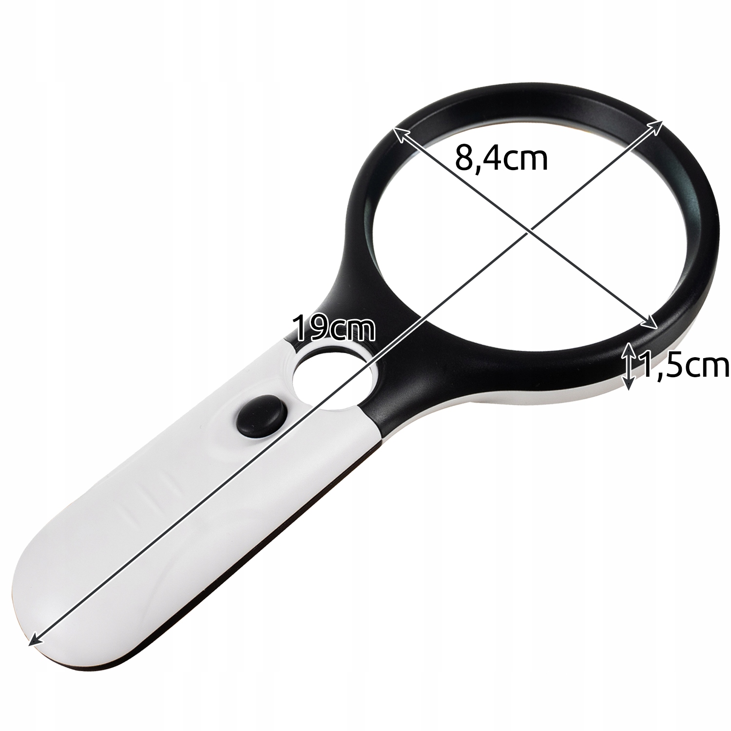 - ВИСОКОЯКІСНИЙ КОРПУС - збільшувальне скло має міцну та ергономічну ручку, що дозволяє зручно тримати її під час використання. Ручка була ретельно розроблена, щоб зручно розміститися в руці, забезпечуючи легкість маневрування та зменшуючи напругу під час тривалого читання. Якісний корпус запобігає вислизанню лупи з руки. У верхній частині ручки є опуклий перемикач, який дозволяє легко вмикати та вимикати підсвічування одним клацанням миші.