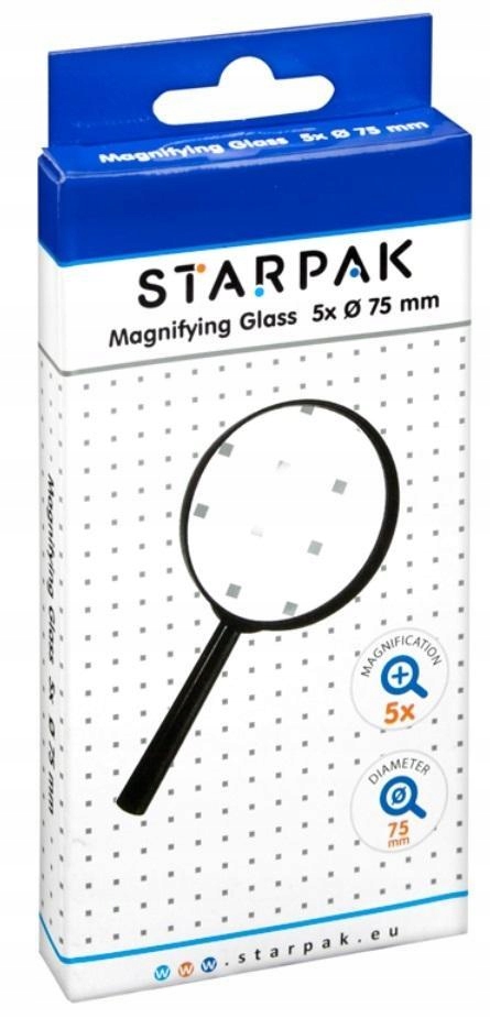 Starpak lupa в міцній рамці, стійкій до подряпин та руйнування скла. Зручна та ергономічна ручка. Ознайомтеся з іншими продуктами Starpak! Мистівець збільшує 5x, діаметр 75 мм. Продукт, упакований у картонну коробку. Розроблений для дітей у віці 3+. Розміри упаковки (висота x ширина x глибина) [см] 18x8x1.5.