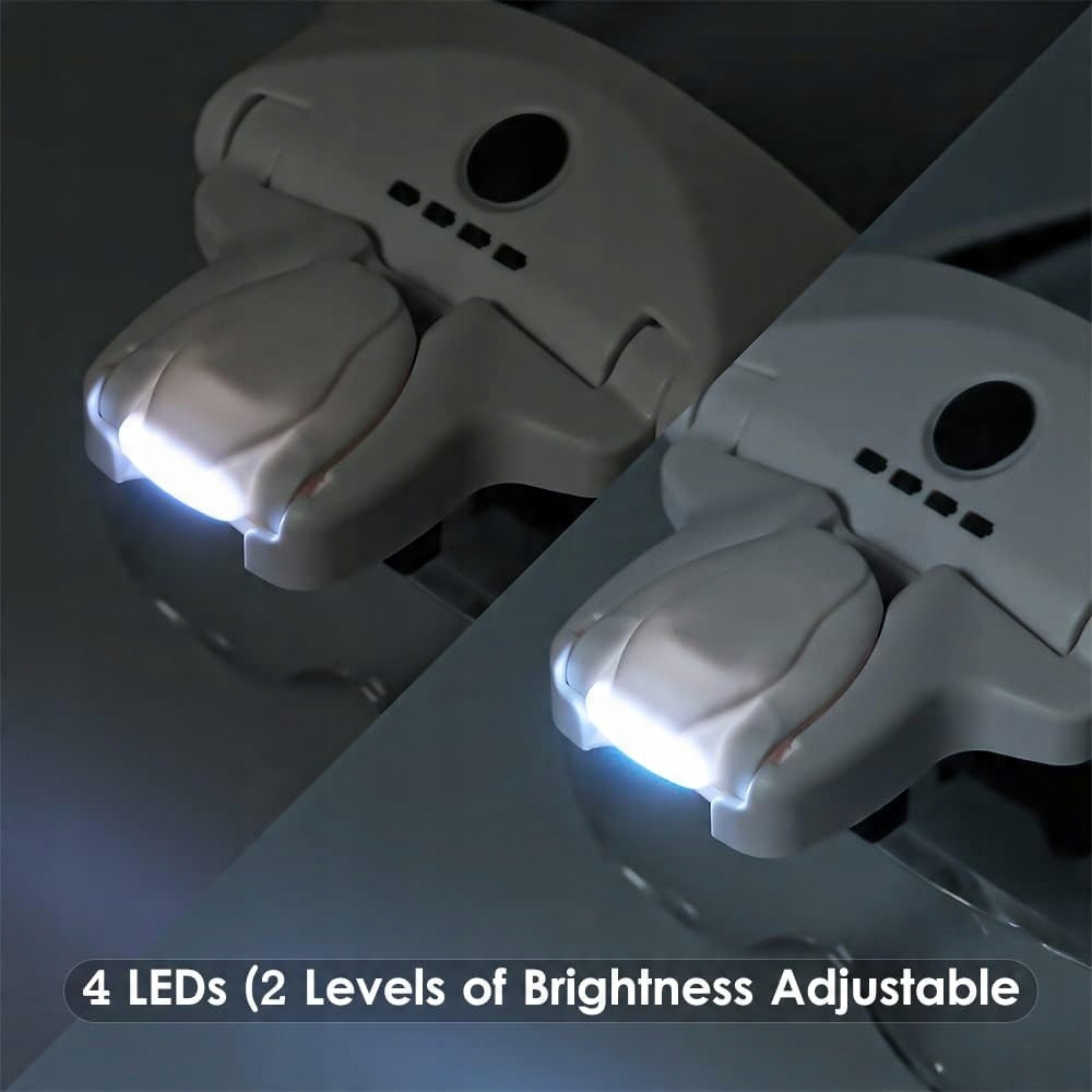 Дружнє для очей світлодіодне освітлення - лупи також мають 4-світлодіодну лампу для використання вночі та в темних умовах із 2 регульованими рівнями яскравості. Збільшувальні окуляри з літієвим акумулятором ємністю 300 мАг. Кут об’єктива та кут освітлення світлодіодного джерела світла можна регулювати, щоб забезпечити точне освітлення джерела світла на поверхні предмета, що робить його зручнішим у використанні.