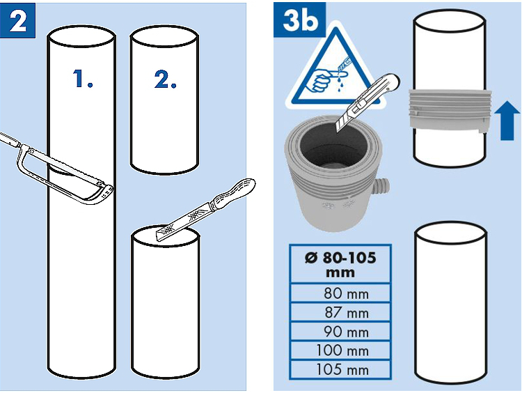3b. Акуратно виріжте (наприклад, ножем) верхню частину колектора (перфоровані кола діаметром: 80, 87, 90, 100, 105 мм уже підготовлені) за розмірами зовнішнього діаметра водостічної труби та насуньте її на верхню водостічна труба.