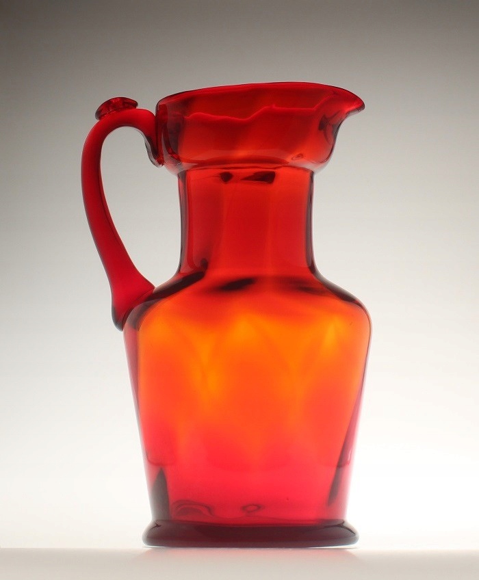 Червоний глечик із содового скла ручної форми. Він походить від Художнього скляного заводу «Staszic» у Домброві-Гурнічій, який є філією Господарського скляного заводу «Ząbkowice» у Домброві-Гурнічій. Дизайн Людвіка Федоровича. 1970/1980