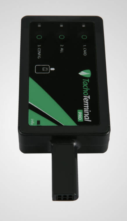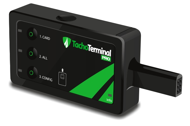 TachoTerminal PRO дозволяє завантажувати дані з картки водія будь-де за допомогою вбудованого зчитувача смарт-карт і власного джерела живлення. Пристрій також дозволяє ефективно та швидко завантажувати дані з цифрового тахографа.