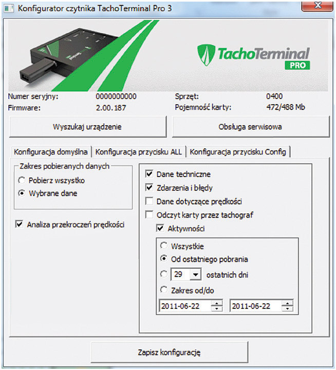 Завантаження даних безпосередньо з картки, без необхідності підключення пристрою до тахографа.Завдяки цьому це універсальний інструмент, підходить як для драйверів, так і для служб управління.
