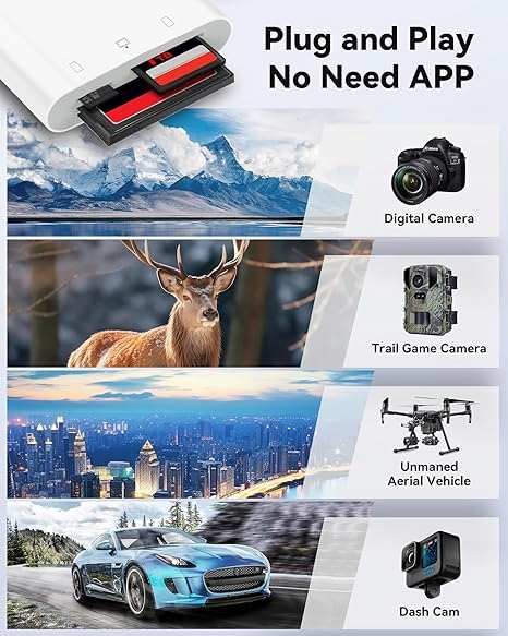 - 3 в 1 Картці Сокет: Цей зчитувач SD -карт підтримує картки SD, Micro SD та CF та підходить до iPhone 15, iPad, MAC, телефону з Android та ноутбуками. Наш зчитувач Micro SD -карт дозволяє легко завантажувати фотографії та відео безпосередньо з SD -карт на телефон, а також обмінюватися фільмами та фотографіями з друзями та родичами в будь -який час та місце.