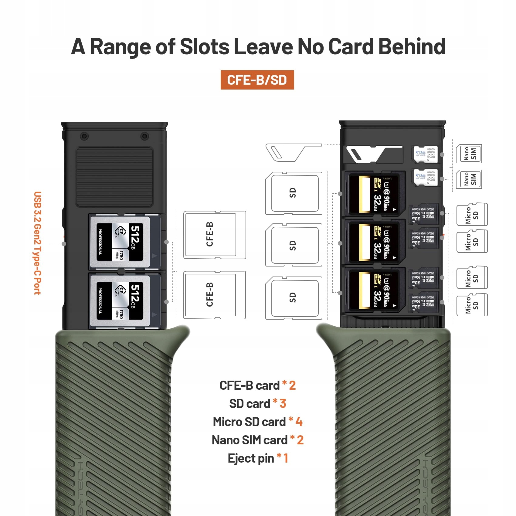 - kick Gen2 забезпечує швидкість передачі 10 ГБ/с. Підтримує картки Cfexpress Cfexpress з теоретичною швидкістю передачі до 1000 Мб/с, підтримує читання SD-карт 4.0/Micro SD (для мікро SD SD потрібно використовувати адаптер) з теоретичною швидкістю передачі до 312 Mb/s. та функції зчитування даних Ultra-Fumpkie. Будівництво з двома відсіками для карт Cfexpress Type B та SD, оснащених інтерфейсом типу C, підключенням та відтворенням. Пам'ять високої ємності: 2 x Cfexpress Type B карта B, 3 x SD -карта, 4 x Micro SD -карта, 2 x Nano SIM -карта, 1 x Викидання Dowel., [IP54 Захист] Корпус виготовлений з інтегрованого алюмінієвого сплаву, він довговічний і довговічний. Внутрішнє та зовнішнє покриття має герметичну структуру розтягування в поєднанні з силіконовим захисним покривом, завдяки якому отримується професійний захист на рівні IP54, який стійкий до падінь, пилу та гідроізоляції., [Всебічна сумісність] високої сумісності з картами CFEXPRESS CFEXPRESS та SD 4.0, SDXC та SDHC-UHS-картами. CFEXPRESS TYP-B/SD зчитувач карт для камер, телефонів, безпілотників та спортивних камер. Сумісний з більшістю Windows 7 та новішими системами, Mac OS 10.6 та новішими, Linux, Android, OS. Ос., Багатофункціональна ручка з викиду - постачається з багатофункціональною аварією викиду, яка служить як інструментом для викидання карт мобільних телефонів, а також тимчасової розсувної викрутки для швидких пластин. [Допоміжне джерело живлення] Обмежений зовнішній інтерфейс живлення забезпечує постійну та стабільну передачу даних у будь -який час.