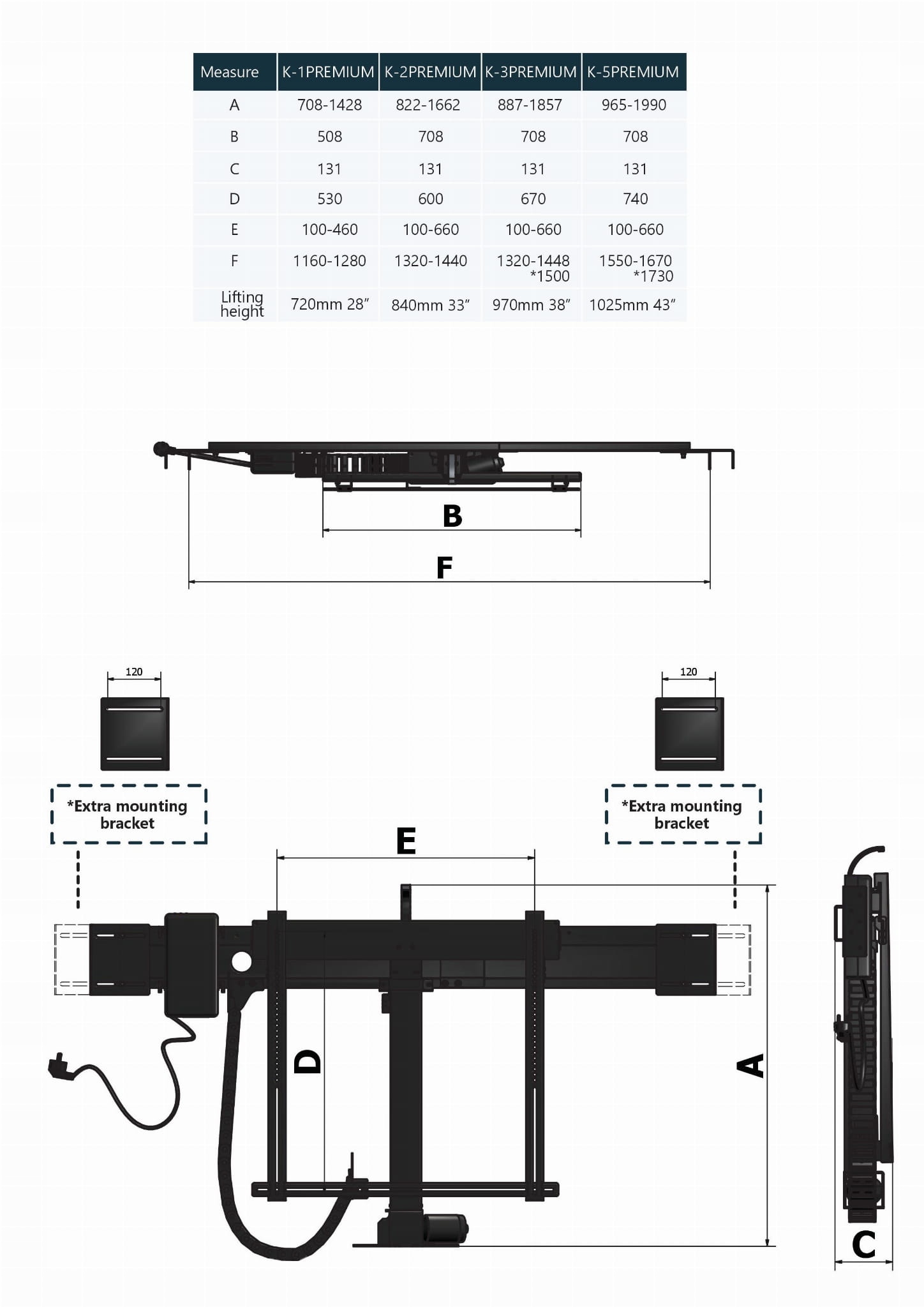Телевізійний підйомник K-Premium слід встановлювати у вибрані вами меблі відповідно до розмірів підйомника. (розміри видно на фото зі списком розмірів серії K-Premium).