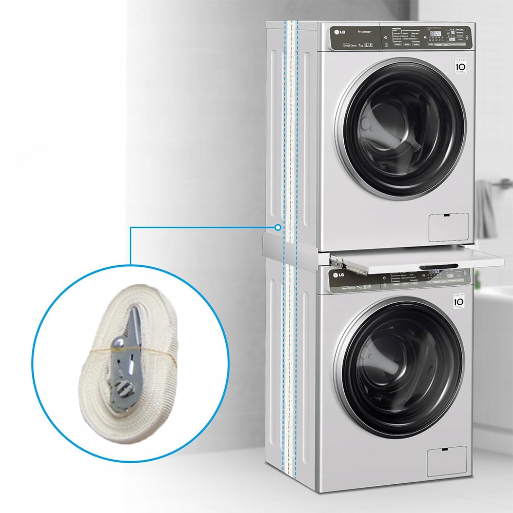 - У комплекті 6-метровий гнучкий кабель дозволяє надійно прикріпити раму до пральної машини, що робить установку швидкою та легкою. Рама є універсальною та підходить для пристроїв розміром до 60 x 60 см.
