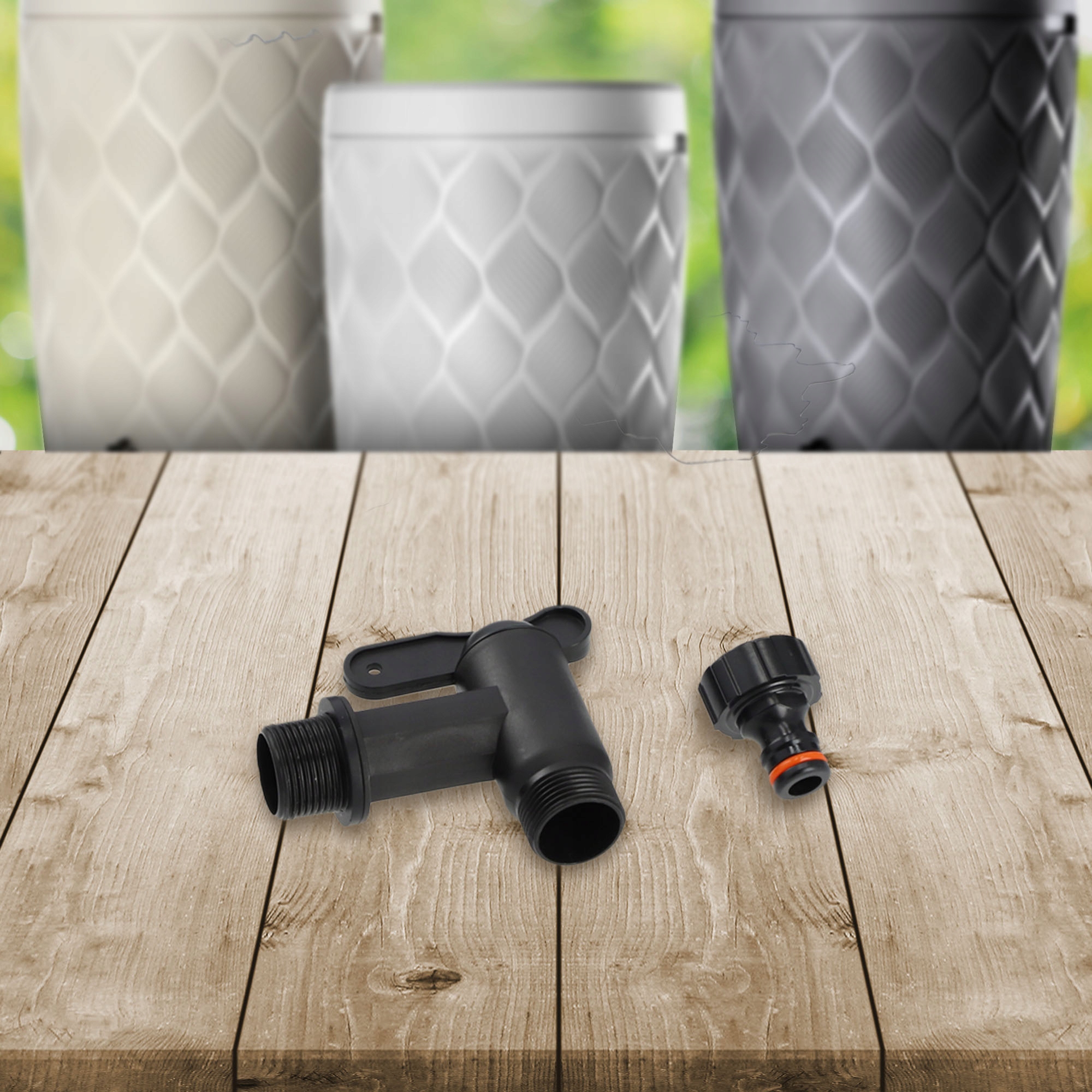 ✅ КОМПАКТНІСТЬ - окремі частини комплекту ємності для дощової води мають ергономічні розміри. Розміри крана та швидкого з’єднання складають 8,5 х 8 та 3 х 4 сантиметри.