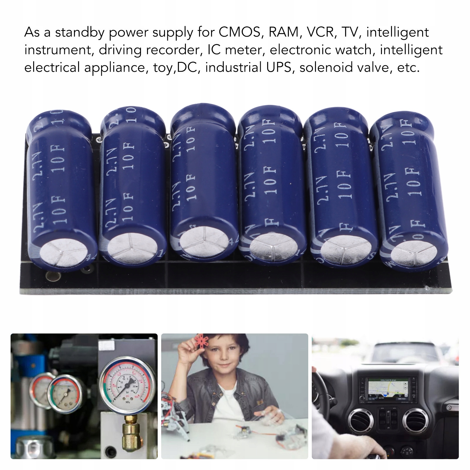 1. Universal: Модуль конденсатора може використовуватися як резервне джерело живлення для CMO, оперативної пам’яті, рекордера, телебачення, інтелектуального інструменту, реєстратора водіння, IC -лічильника, електронного годинника, інтелектуальних пристроїв, іграшок, двигуна, промислового ДБЖ, соленоїдного клапана, ІС Голос тощо