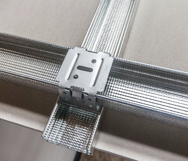 Він кладеться на профіль, який підвішується на анкерному підвісі, а гачки з’єднувача кріпляться до внутрішніх стінок профілю, розташованих внизу. З’єднує профілі перпендикулярно.