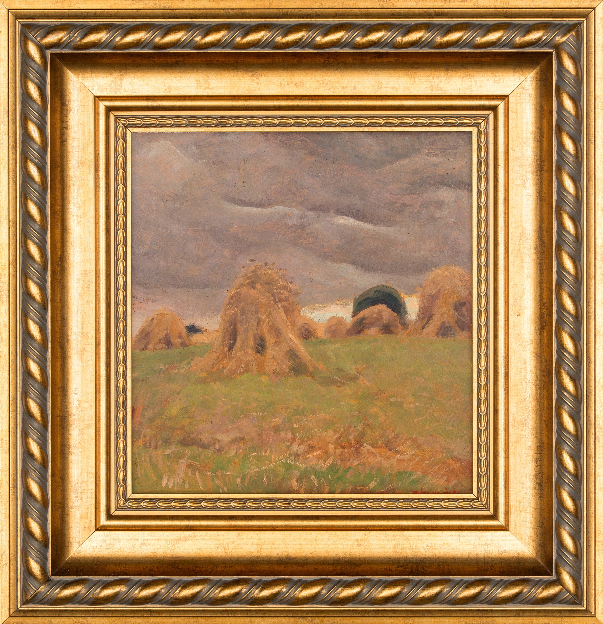 Автентичний твір відомого татранського художника Зефірина Цвіклінського, який представляє літній пейзаж зі снопами зерна. У вертикальній композиції художник показав зелені поля зі снопами скошеного зерна на передньому плані. Вдалині кілька дерев поруч і ділянка світло-блакитного неба. Вгорі сіро-блакитні грозові хмари, сповіщаючи про наближення літньої грози.