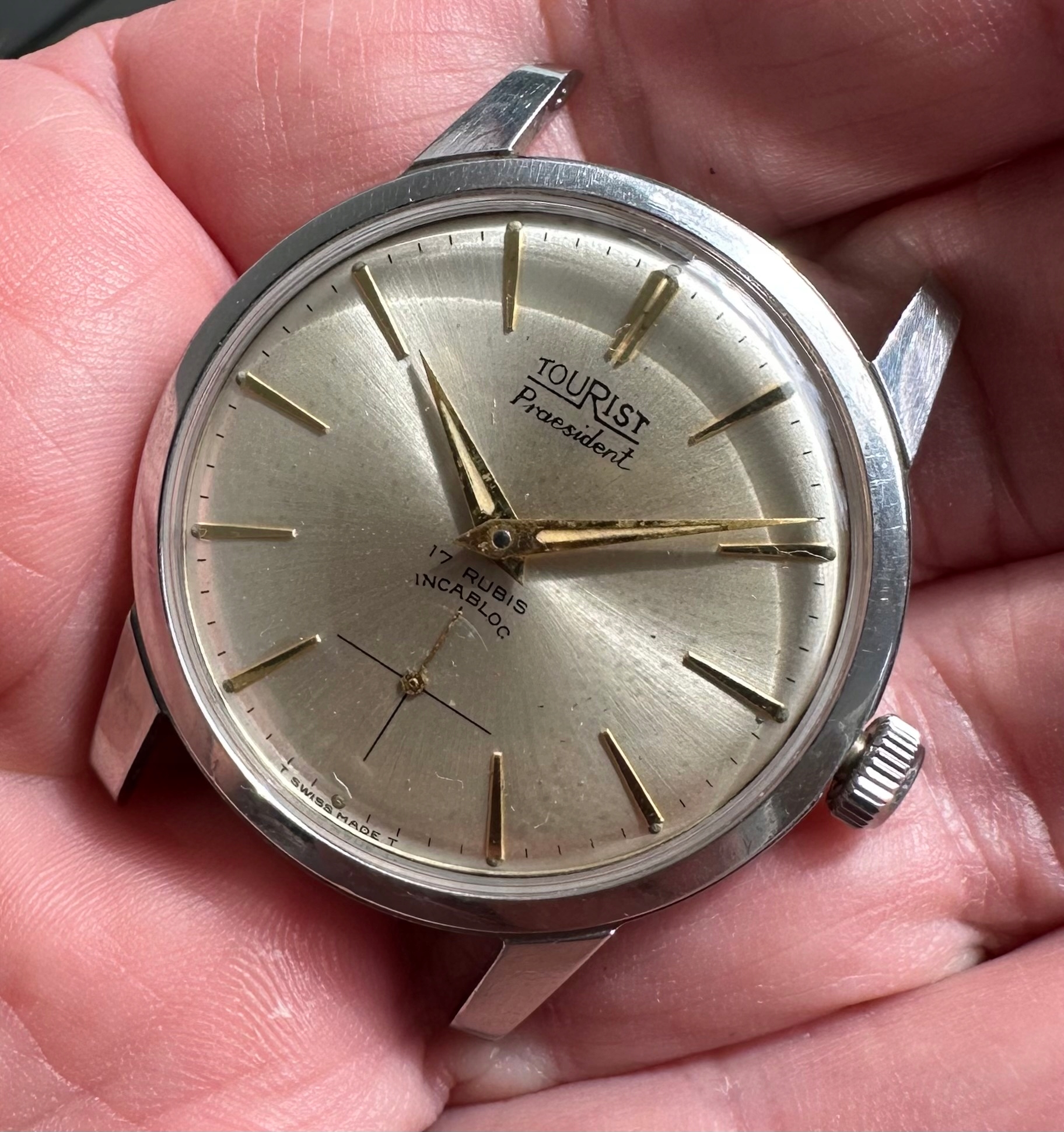 Оригінальний радіальний циферблат, який ніколи не реставрувався, підписаний: TOURIST PRAESIDENT 17 rubis incabloc T SWISS MADE T. Люмінофорні аплікації на циферблаті. Оригінальні фосфорні наконечники. Скло замінено на нове. Оригінальна заводна головка.