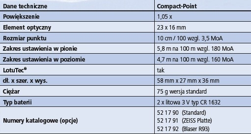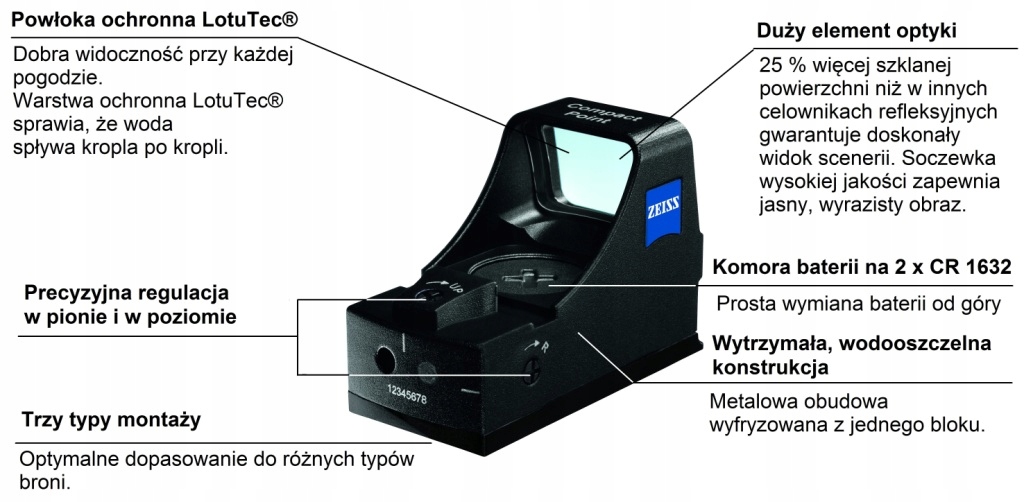 Compact-Point від Carl Zeiss пропонує мисливцям на Три фундаментальні практичні переваги полювання: ергономічний огляд, краще зображення поля стрільби та більша вірогідність попадання завдяки маленькій яскравій червоній крапці, встановленій вручну. Практичний досвід і технологічні знання в області ергономіки прицілювання створюють оптичну інновацію, ідеальну для стрільби в русі.