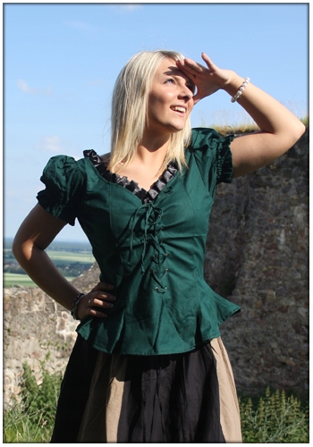 Красива, благородна середньовічна блуза в стилі кораж з короткими рукавами. Шнуровка спереду.