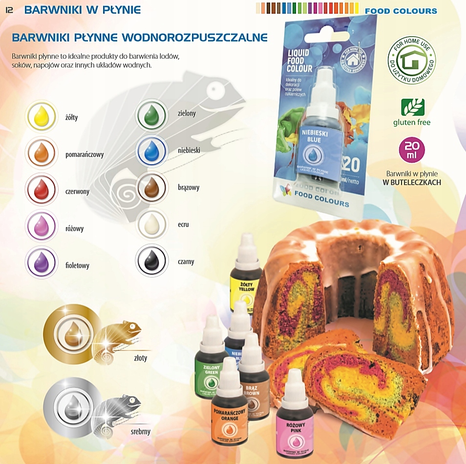 Основна мета використання барвника: торти, креми, морозиво, напої, желі, спирти, маси, марципан та всі продукти, що містять воду.