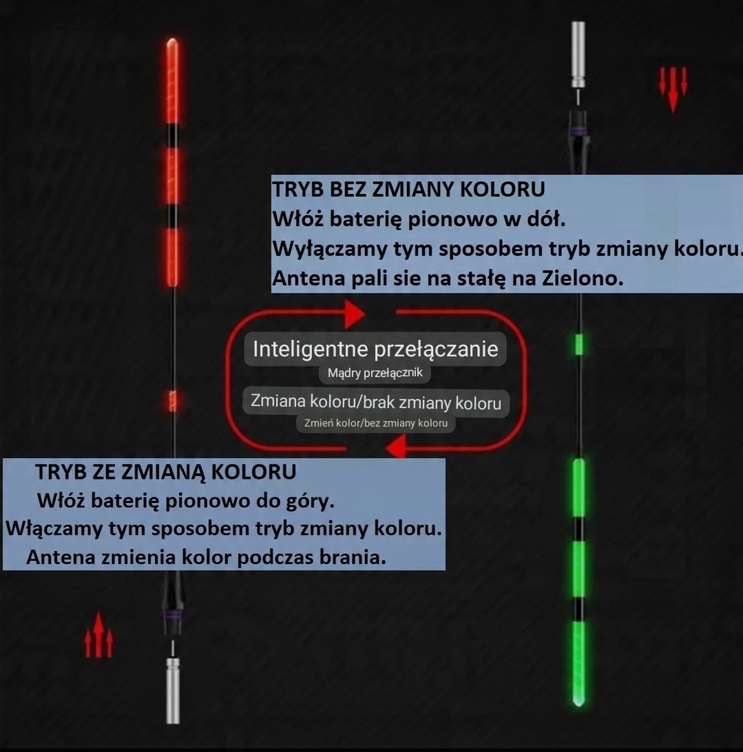 колір антени одразу змінюється із ЗЕЛЕНОГО на ЧЕРВОНИЙ. Хвилі та вітер не впливають на зміну кольору. Датчик вмикається тільки при покльовці.