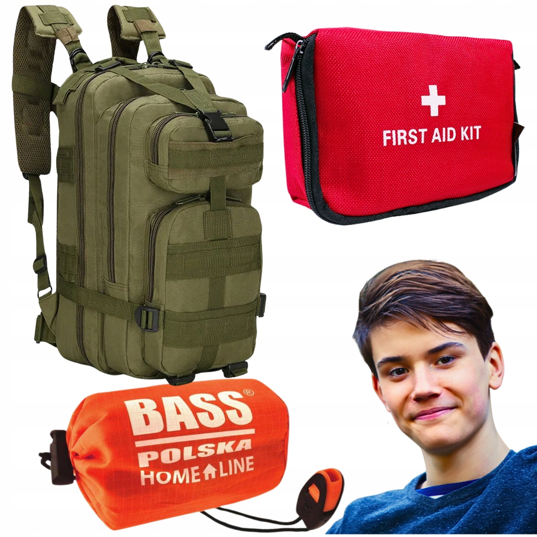 Зелений тактичний рюкзак + термоковдра для сну + червона міні-аптечка