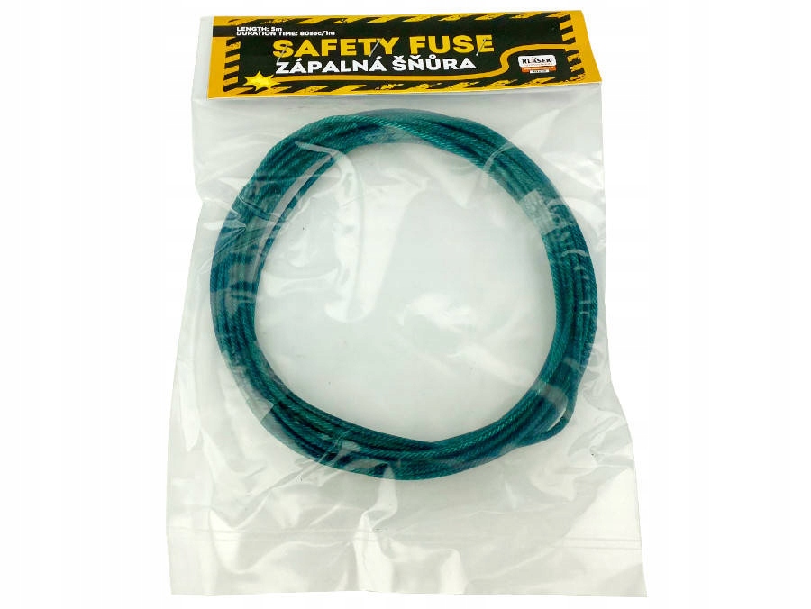 Запал зеленого кольору, довжиною 5 м, діаметром 2 мм. Час горіння приблизно 80 секунд/1 метр.