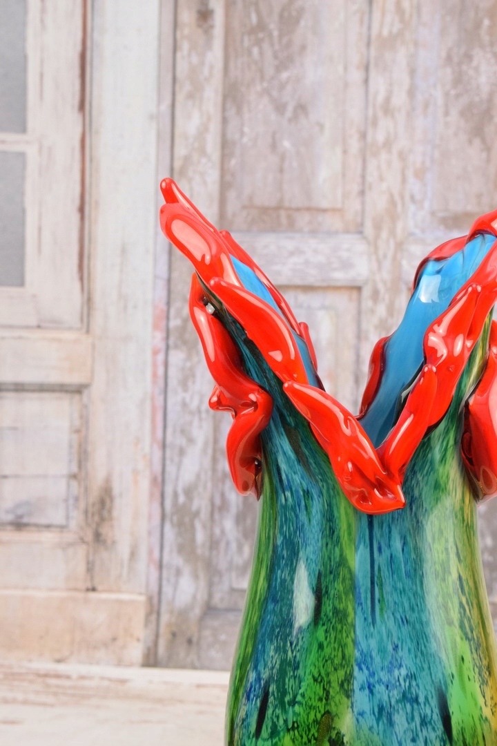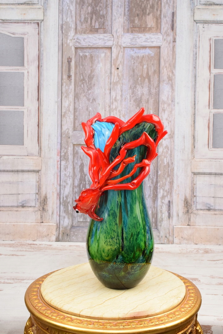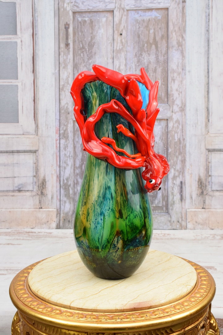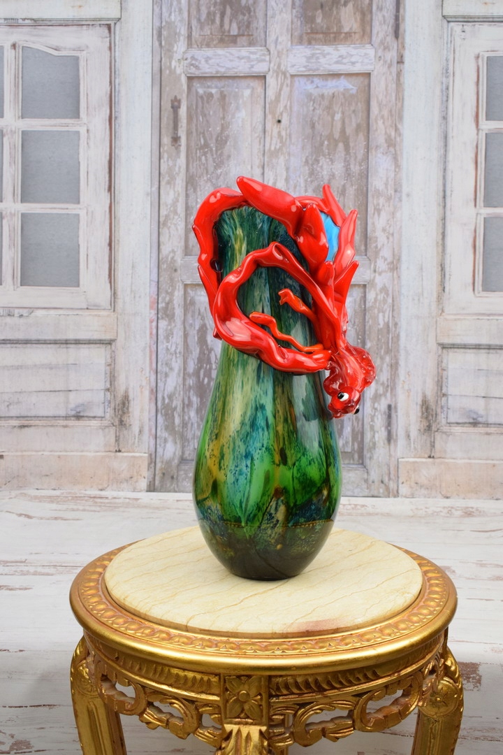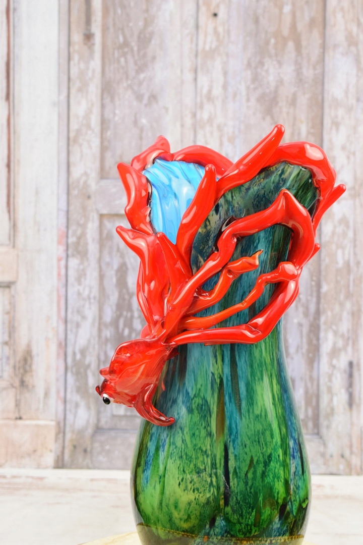 Зелено-червона ваза з рибою в муранському стилі - товсте італійське скло - подарунок
